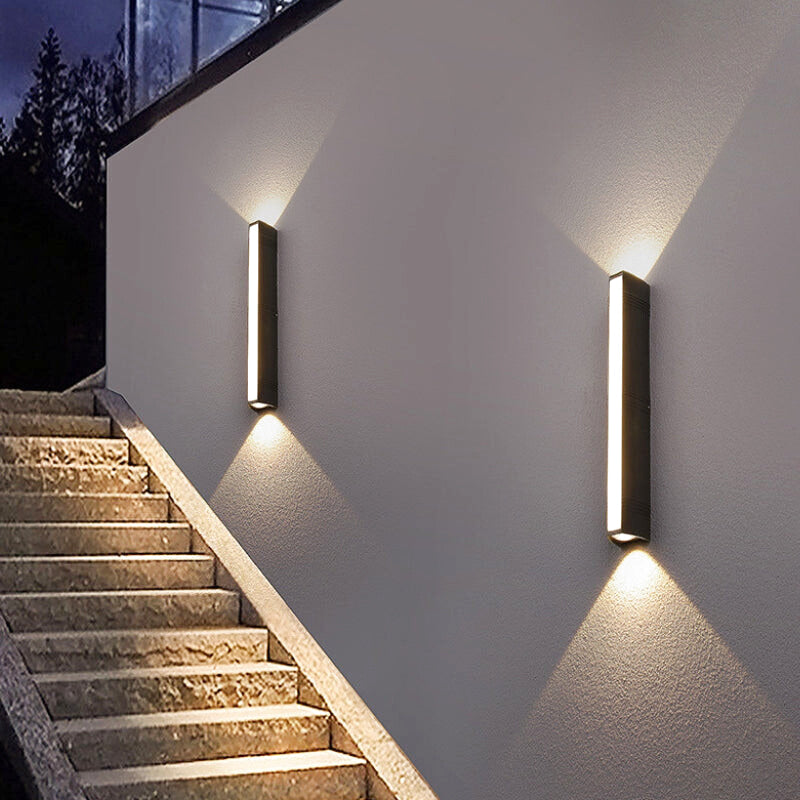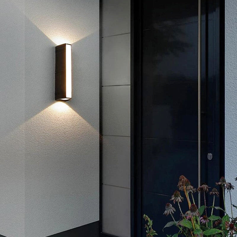 Fabriquée en aluminium avec une finition noir mat, elle est conçue pour résister aux conditions extérieures. Le luminaire projette une lumière LED indirecte vers le mur (effet "Wall Washer"), créant un halo lumineux architectural et accueillant, sans éblouissement direct.