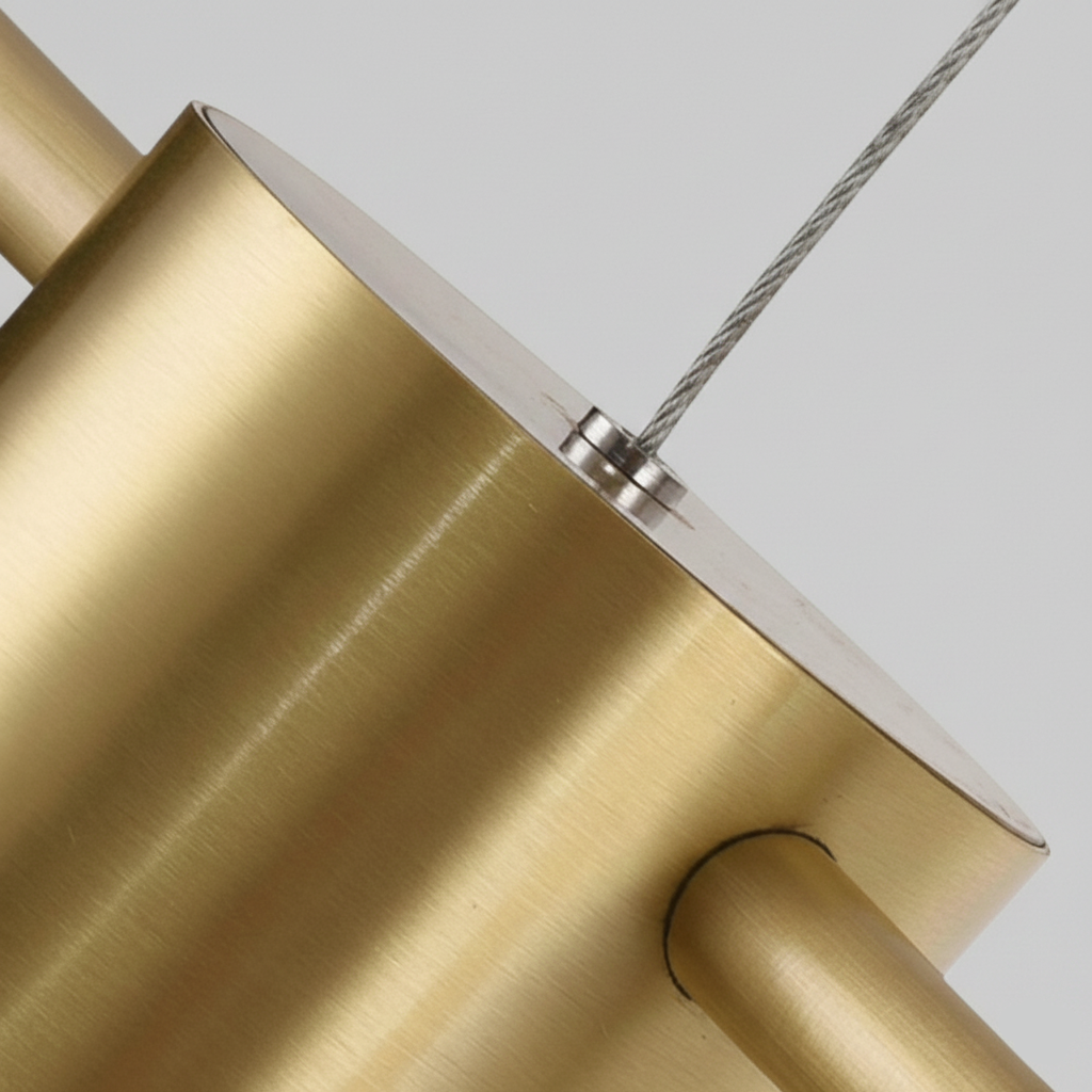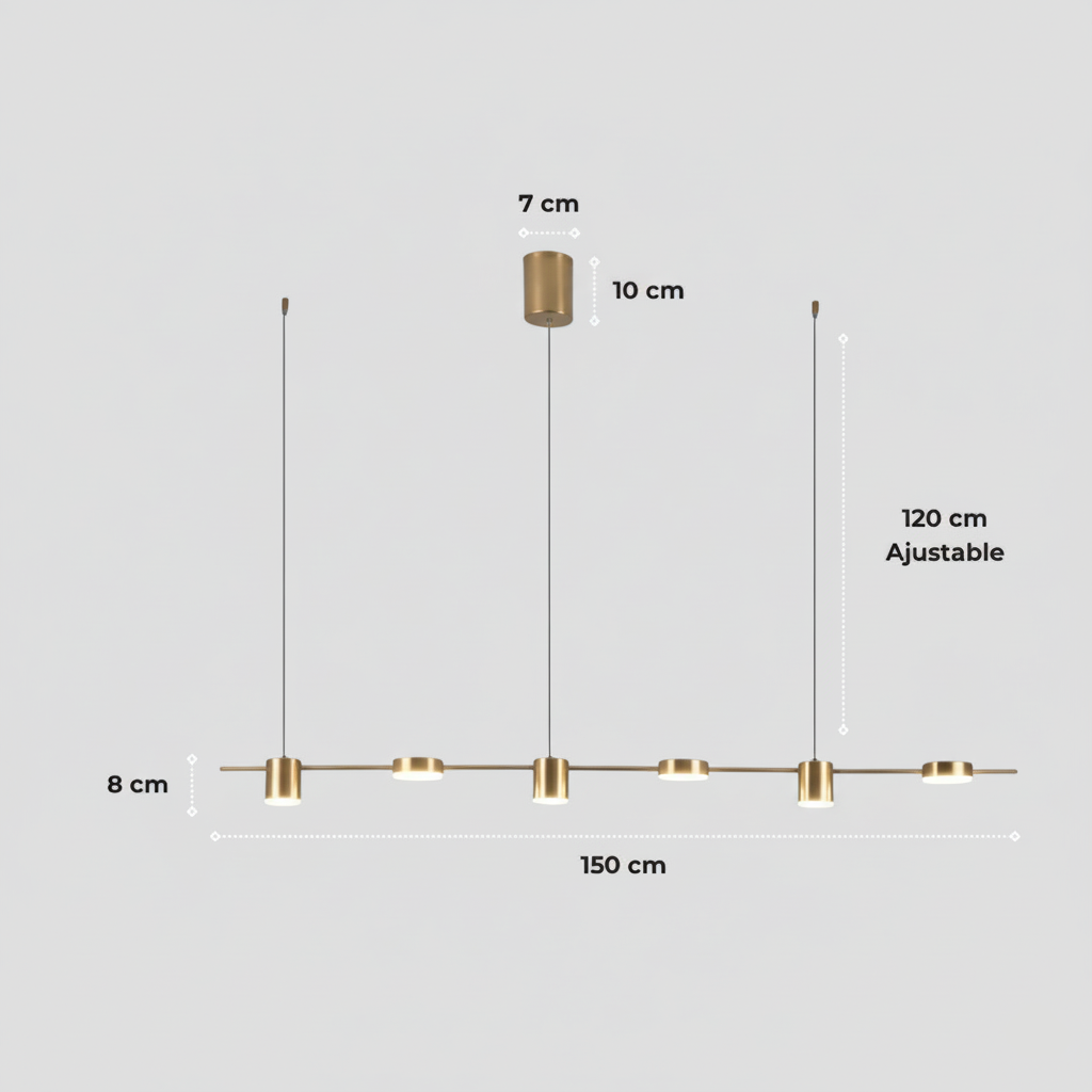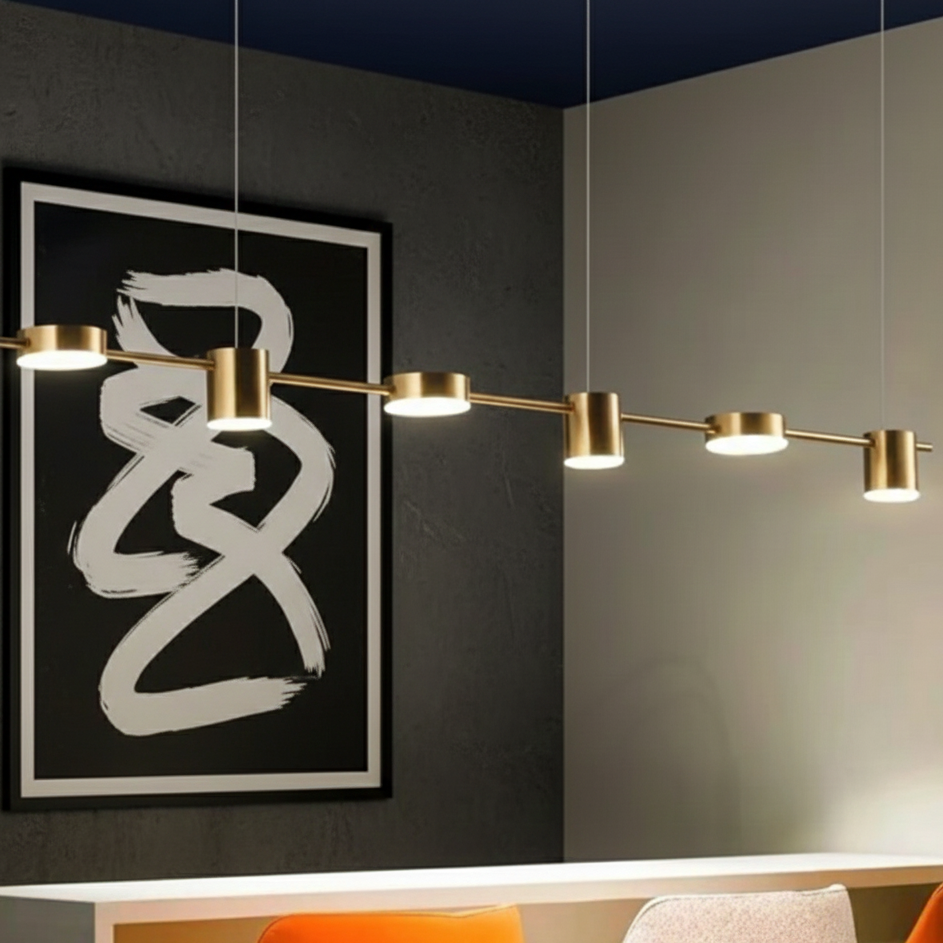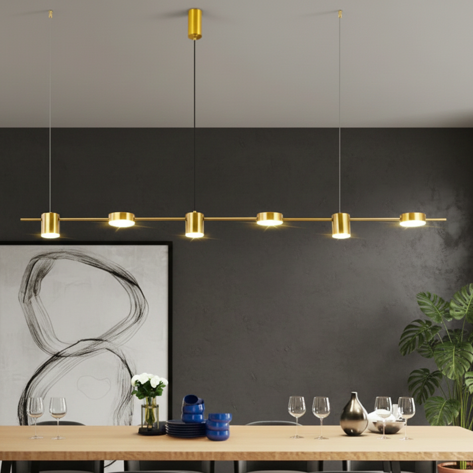 Cette suspension luminaire au design linéaire et minimaliste se distingue par sa finition en laiton doré (Brass). Elle se compose d'une fine barre horizontale de 150 cm de longueur, sur laquelle sont répartis 6 diffuseurs cylindriques LED orientés vers le bas.