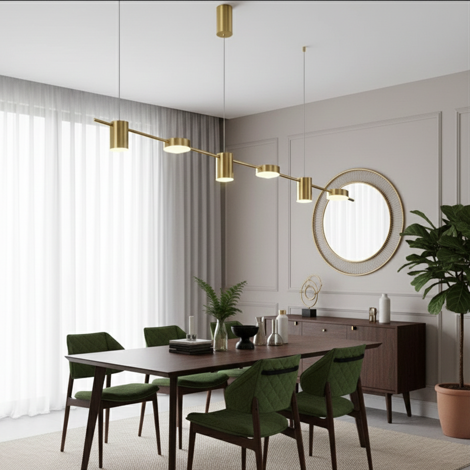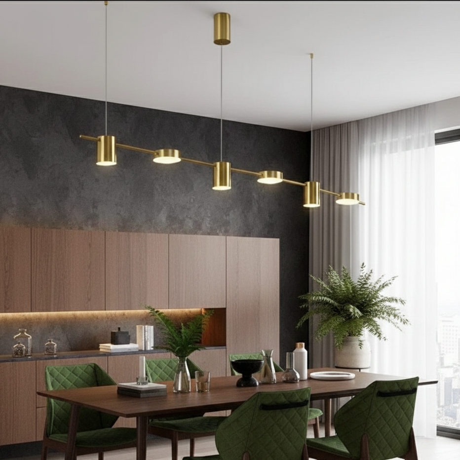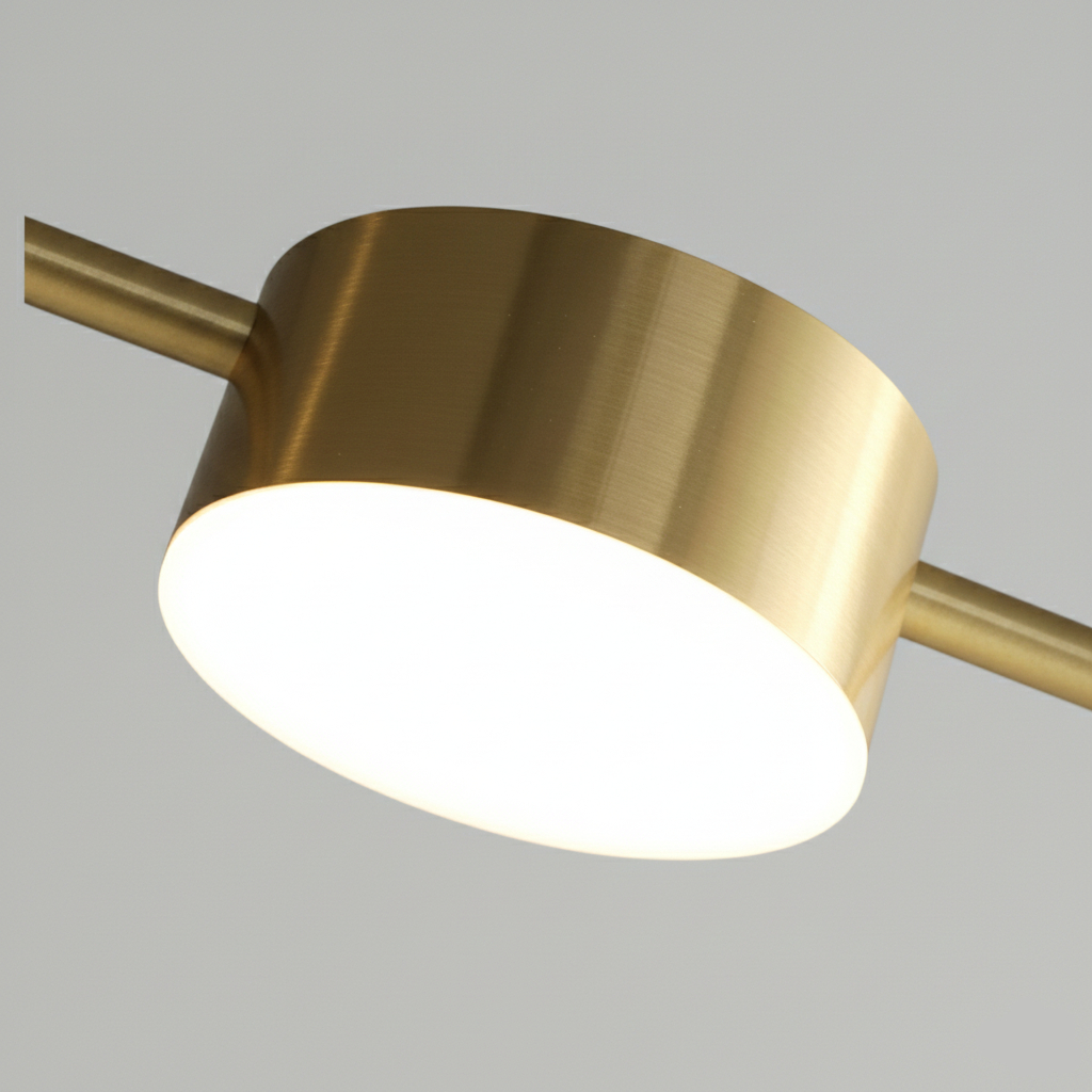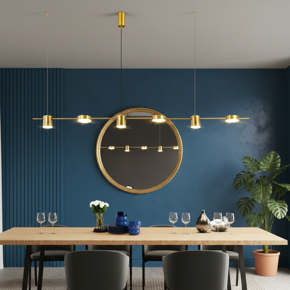 Cette suspension luminaire au design linéaire et minimaliste se distingue par sa finition en laiton doré (Brass). Elle se compose d'une fine barre horizontale de 150 cm de longueur, sur laquelle sont répartis 6 diffuseurs cylindriques LED orientés vers le bas.